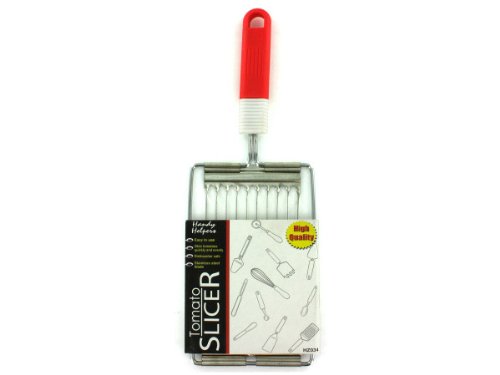 Quickly and evenly slice tomatoes with this slicer Has sharp metal blades a plastic handle with grip rings and is completely easy to use Comes packaged in a wrap card Has a hanging hole in the handle for organizing Measures approximately 9 12 Stainless steel tomato slicer Dimensions 35 x