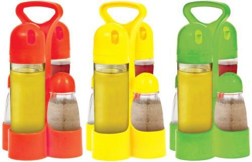 4 Piece Cruet Set with Rack Includes oil and vinegar cruets and salt and pepper shakers Plastic and glass 3 assorted colors Case Pack 24 Please note If there is a colorsizetype option the option closest to the image will be shipped Or you may receive a random colorsizetype Allof the