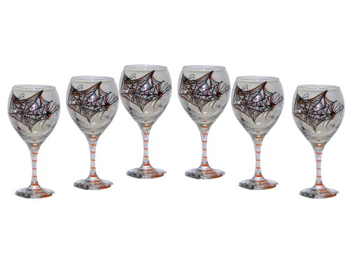 Set of 6 The witches webs are back for Halloween One of the best ways to celebrate Halloween is to dress up your party with our spidery web hand painted balloon wine glasses These black orange collectibles can be used year after year Each glass features a big web with spiders all around The